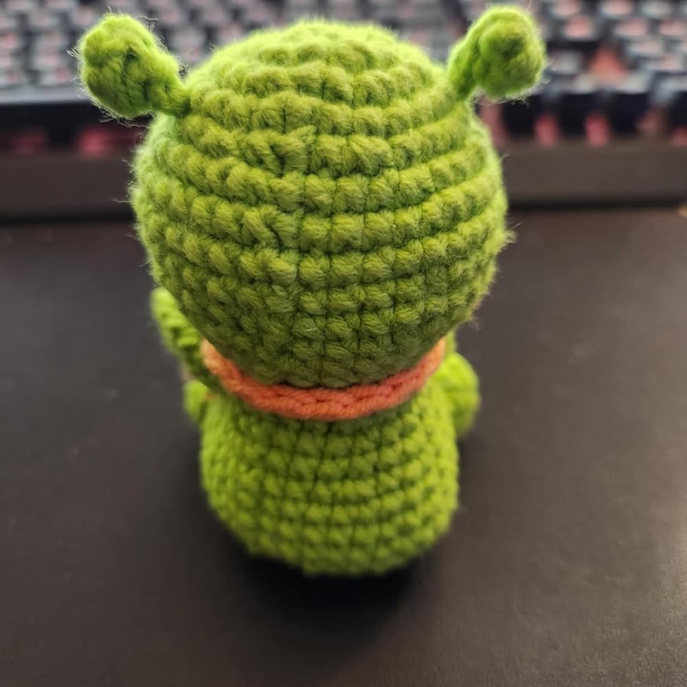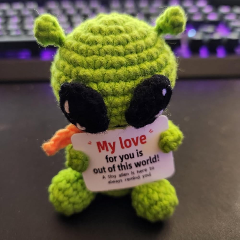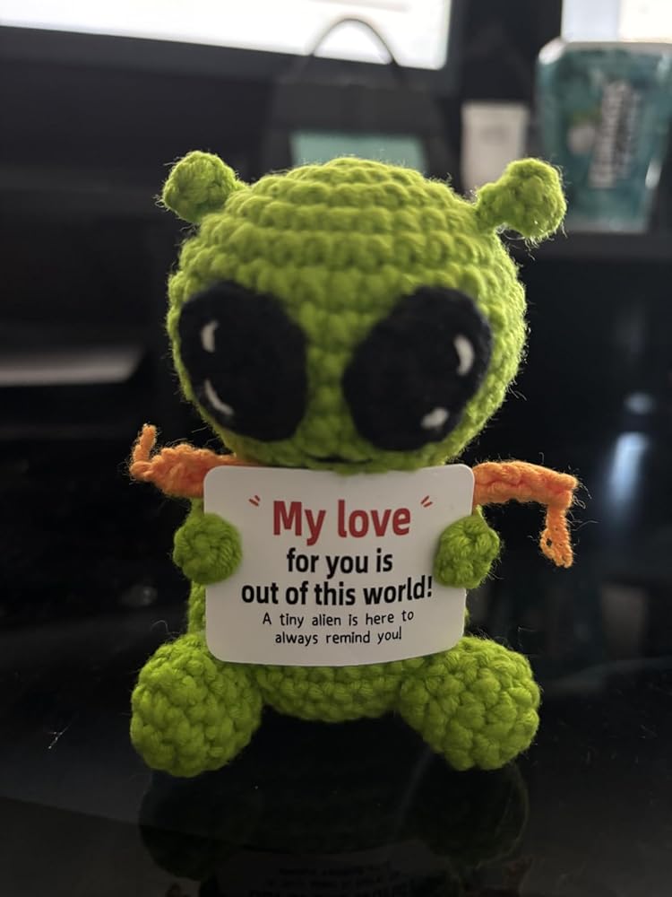 This little crochet positive alien is really cute. I particularly like the orange scarf. It makes the green pop. I also like the big eyes and the antenna nobs. It is made with soft yarn, has vibrant colors, and is squishy. The sign is firmly affixed. The alien sits up on his own. It has enough structure to it that it doesn't topple easily. It's small, so it can fit in many places. This alien brought a smile to my face, and I'm sure it would bring a smile to many others. The sign the alien is holding reads "My Love for you is out of this world! A tiny alien is here to always remind you!" If you don't want to keep it for yourself, it would make a great gift either by itself or in addition to a greeting card. I would purchase this item again if needed, and I would recommend this item to my family.